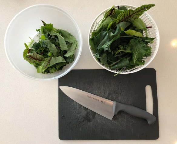 It is beneficial to switch your greens up. Don’t use too much raw spinach as it is high in oxalic acid which can cause kidney stones in sensitive people — In this case I took to the yard and grabbed a small basket of greens such as broccoli leaves (yes! they are a super food) and sorrel.